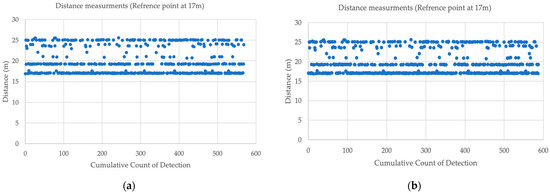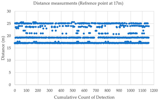Table 4 and Table 5 show the distance measurement when placing the tag at various distance ranges to explore accuracy at each point for a 1 min interval. The anchor was at 1.65 m height, and the tag was at 1 m height. The UWB distance ranging measurements were compared to the oblique distance. The experiment found at 17 m that the MAPE in the distance was 2.71 m. Figure 10 shows the distance measurements at point 17 m. This issue occurred due to multipath because of the consistent distance fluctuation as shown in Figure 11.