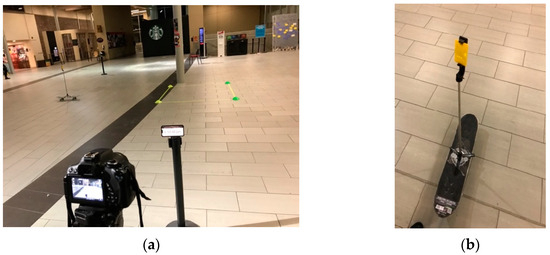(a) Camera for recording the experiments, (b) UWB tag on a skateboard.