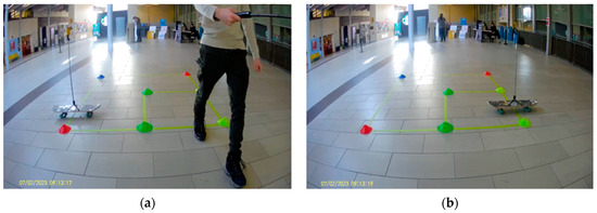 This study aimed to evaluate the accuracy of UWB technology through dynamic experiments using anchors and tags. Numerous experiments were conducted to measure the position and movement of moving objects. In the first set of experiments, four anchors were fixed in a tripod location in a study area measuring 10 m by 10 m. Two tags were attached to selfie sticks, with one held by a pedestrian and the other attached to a skateboard. The tag was placed at the center of the skateboard, as shown in Figure 13, and the other tag was held by the pedestrian at a height of 2 m to avoid any line of sight issues. A conflict zone measuring 2 m by 2 m was outlined to track the positions of the tags. Upon enabling UWB on the anchors and tags, the tags began receiving and storing distance measurements and timestamps.
