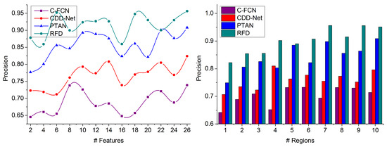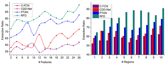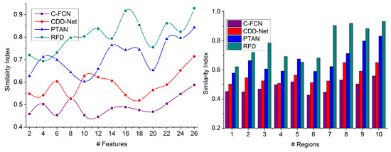 The performance assessment of the proposed technique is presented in this section using a comparative study. This study analyzes the metrics similarity index, extraction ratio, precision, false rate, and processing time by varying the features and regions. The features are between 2 and 26, and the regions are between 1 and 10. The existing C-FCN [27], CDD-Net [17], and PTAN [19] are augmented with the proposed technique for comparison. The experimental images used in Figure 1, Figure 2, Figure 3, Figure 4 and Figure 5 are extracted from [36,38] with 10,000+ training and testing inputs.