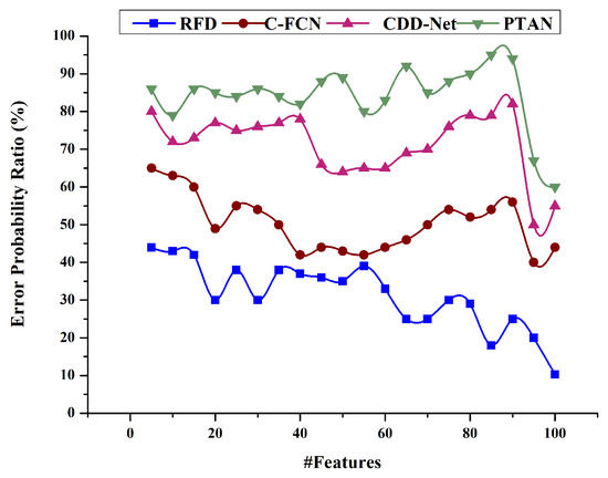 The pattern matching for the and the training inputs are performed using and . For any single identified, the is performed such that . The possible combinations are identified and for concatenation. Therefore, the and regions (without are jointly used for detecting the object (Figure 5). In the first instance, the pattern matching is processed for identifying the overlapped and non-overlapped features and maximum peaks in the feature map. Therefore, the maximum similarity feature identification outputs precise target region detection, and hence, the region-wise feature distribution mitigates the false rates and is retained without non-overlapping features, for instance. The false rate-generating features in the images identify distinguishable regions through improved precision wherein the extracted features, such as intensity and contrast, impact the training inputs. The output of the DRL is to identify the overlapping features and mitigates the false rates in region selection and the pattern-matching processes to identify a target. This computation jointly allows generating feature prediction for the instances even if they overlap in the given image for optimum performance of generic target detection. In this manuscript, the possibility of identifying the important difference between the features and regions through DRL and suppressing the non-overlapping features is based on reducing the false rates. Therefore, the minimum false failures and iterations are achieved. Hence, the region selection and pattern matching are consecutively processed using deep recurrent learning iterations to improve precision and identify the region of interest in this image. This generic target detection using similarity verification reduces the processing time and false rate. The extracted feature map and dense embedding features are used for target object detection. The analysis of and and for the varying is presented in Figure 6.