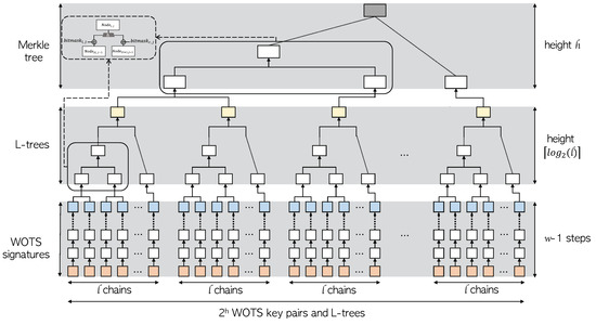 XMSS uses a Merkle hash tree of height h and a binary L-tree of height to reduce the size of the public key. Two trees are used to reduce WOTS verification keys to one XMSS public key. The overall structure can be found in Figure 2. The public key of WOTS obtained using WOTS as described above constructs the leaf of the L-tree, which is an unbalanced binary tree. If there is no power of 2 leaves, a node without a right sibling is moved up until it becomes a right sibling of another node. In the case of the L-tree, the same structure as in Figure 1 is used. However, a bitmask different from that of the Merkle tree is used. The upper leaf node of the L-tree created in this way becomes the lower leaf node of the Merkle hash tree. As a result, the root node of the Merkle tree becomes the final XMSS public key. The bit length of this XMSS public key is , the signature length of XMSS is , and the private key of XMSS is less than .