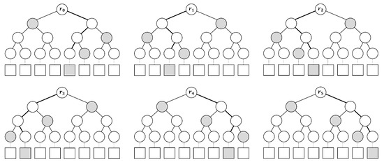SPHINCS defines and uses FORS, a few-time signature improved from HORST [21]. FORS is defined in terms of integer k, and is used to sign -bit string. The private key of FORS consists of random bit values and is divided by k set of t values. Overall, it is deterministically derived from SK.seed using the pseudo-random function(PRF) and the key address of the hypertree. To obtain the FORS public key, k binary hash trees are constructed on the set of private key elements. Each t value is used as a leaf node and k binary hash trees with height a are created. Figure 4 shows the hash tree of FORS with and for message (100 010 011 001 110 111). FORS uses H, which is addressed using the location of the FORS key pair and the location of the function call within the tree. With WOTS, the root node compresses using the Tweakable hash function (). is an efficient function that maps -bit message M to -bit hash value MD using a function key of public parameter P and tweak T, and is expressed as Equation (5). The FORS public key is an n-bit value. The signing process of FORS is as follows. Given a message of bits, the k string of a bits is extracted. This bit string k has the index of each single leaf node of FORS. The signature consists of these nodes (indexes) and authentication paths (See Figure 4).