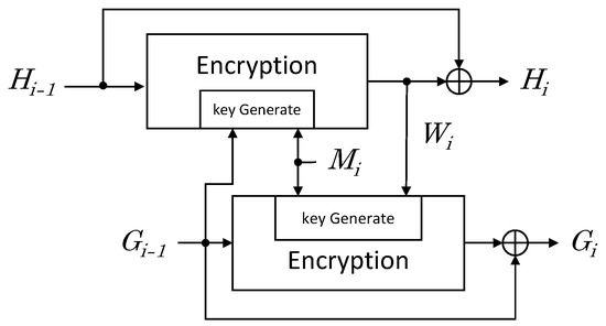 An iterated hash function is determined by an easily computable function h(·,·). The function h is called hash round function. The input message is divided into block sizes, and the hash round function calculates the next hash value using the divided message block and the previous hash value. The number of iterations of the hash round function is repeated by the number of message blocks to obtain the final hash value. Equation (6) is a modification of the iterative hash function.