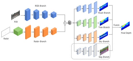 As shown in Figure 3, we propose an end-to-end depth estimation network using an encoder–decoder architecture. The dual-branch encoder includes a branch with RGB images as input and a branch with sparse depth maps generated by radar as input, aiming to make full use of two types of data to achieve effective feature extraction. The two branches work independently without interference from each other. Specifically, the RGB-branch is constructed by ResNet-34 [42], which is pre-trained on ImageNet [43], containing four convolutional modules to gradually extract image features and obtain a feature map of 1/32 size of the original image. The situation is somewhat different for the radar branch, as the data are sparser compared to RGB images. This branch is built in two stages. The sparse depth map is first preprocessed by a series of sparse invariant convolutions before the derived features are transmitted to subsequent residual blocks for further feature extraction. Residual blocks are constructed symmetrically to the RGB branch, except that they contain fewer channels. The fusion of features takes place in the intermediate part of the network, where feature maps generated by two branches are concatenated and fed into the decoder.