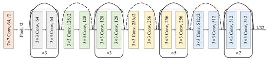 In the image branch, we made the necessary adjustments to the ResNet-34 network to meet the requirements of feature extraction in the depth estimation task. The fully connected layer was deliberately removed. This structural adjustment can be clearly seen in Figure 4. After architectural modifications, the network takes the form of four key convolutional modules, each of which plays an important role in the feature extraction process. We perform a series of layer-by-layer convolutional operations to enable the image to progressively capture feature information at different levels of abstraction. This design enables the network to provide richer semantic information for the input image data, laying a solid foundation for subsequent task processing.