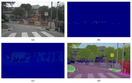 Examples of data used in the experiment. (a) RGB image; (b) millimeter-wave radar data (enhanced by 5×); (c) depth labels; (d) semantic segmentation labels.