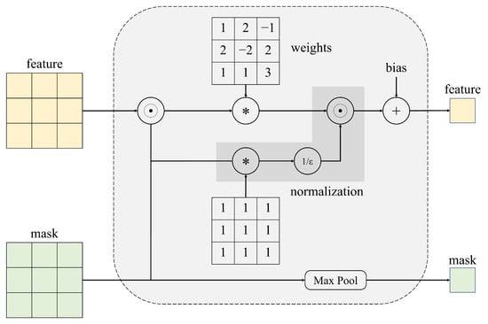Sparse invariant convolution procedure. The symbol “*” in the image indicates a two-dimensional convolution operation, and the symbol “⊙” indicates the multiplication of the corresponding pixel positions.