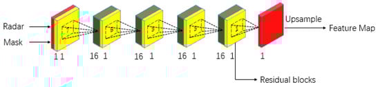 As shown in Figure 7, we construct a structure to stack five sparse invariant convolutional layers, in which the output of the fourth layer is passed into subsequent residual blocks, and the output of the last layer also generates a feature map after up-sampling. Supervision is applied for better optimization.