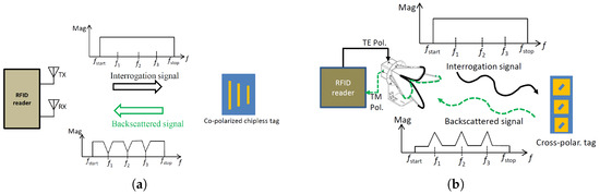 Frequency-coded RCS-based chipless RFID system: (a) co-polarization (b) cross-polarization.