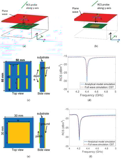 Grounded co-polarized tags: (a) CST setup dipole array (plane wave and RCS probe along y-axis) (b) CST setup square patch (plane wave and RCS probe along y-axis) (c) top and side view of dipole array: L = , w = , g = and d = (d) RCS response of the dipole array using analytical model and CST full wave simulation (e) top and side view of square patch: L = , w = (f) RCS response of patch tag using analytical model and CST full wave simulation.