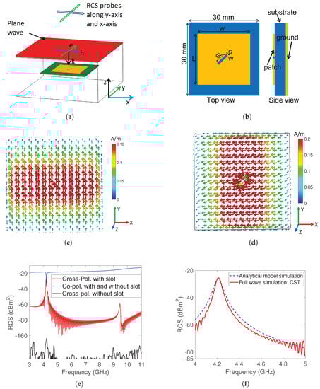 Grounded cross-polarized tag: (a) simulation model wherein e, h, and k vectors respectively signify the orientations of the electric field, magnetic field, and wave propagation direction (b) top and side view: L = , SL = and SW = (c) surface current distribution for co-polarization (d) surface current distribution for cross-polarization (e) cross-polarization component enhancement by the slot (f) RCS response using CST and analytical model.