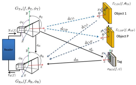 This section presents a comprehensive mathematical framework for the FC chipless RCS-based RFID system, taking into account various practical aspects such as frequency and polarization dependence, angular antenna gain, tag orientation, and clutter reflections. The majority of previous research in the chipless RFID field has primarily concentrated on simulating and measuring tags in scenarios where only a line-of-sight (LOS) path is considered, meaning that no reflector is present in the tag’s environment [1,2,3,4]. In a cluttered environment, the signal transmitted from the chipless RFID reader follows not only the path of reflecting off the tag but also the path of bouncing off various environmental objects, resulting in different propagation paths.