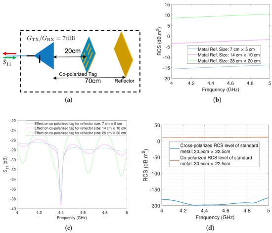 The graphs presented in Figure 6b serve as visual representations of the RCS levels across three distinct dimensions. Concurrently, Figure 6c provides insight into the response for a reflector positioned away from the reader antenna. It is worth highlighting that when no reflector is present, a consistent response emerges, devoid of any undulations stemming from constructive and destructive interference. However, with the integration of a reflector measuring , noticeable alterations manifest within the response attributed to the co-polarized dipole array tag. This dimension represents the minimum size at which a reflector, situated away, affects co-polarized based tags.