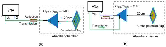 Sketch of the measurement setup and parameters, with “1” representing port-1 and “2” representing port-2: (a) measurement for co-polarized tags (b) measurement for cross-polarized tag.