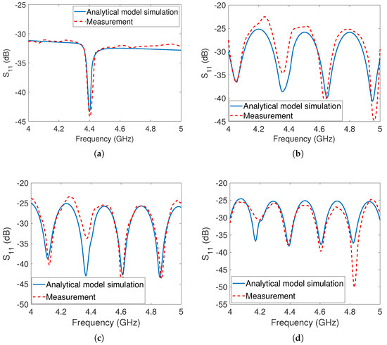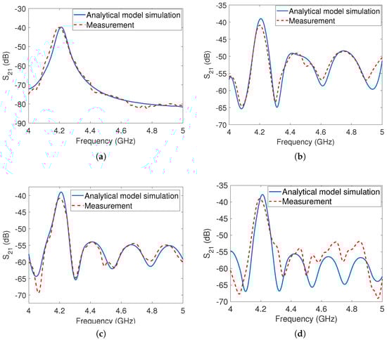 In the second phase of measurement, the reflector was taken into account and positioned behind the tags at various locations, as illustrated in Figure 5b, and the measurement outcomes were recorded. The results of the measurements with the reflector are displayed in Figure 8b–d with the reflector placed at distances of , , and from the reader antenna, respectively. The measurement setups, considering the presence of the metal reflector at all three positions, were simulated using the developed analytical model. It was observed that there was a close match between the simulation and measurement results. However, both the simulation and measurement results revealed the presence of multiple undesirable notches in the responses. These unwanted notches caused the original notch at to disappear, rendering it challenging for the detection algorithm to identify the co-polarized dipole array tag.