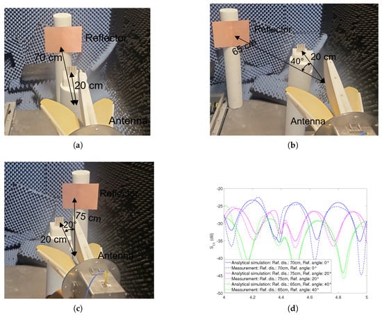 The dipole tag’s analytical simulations and measurements: (a) Tag at from the antenna without metal reflector (b) Tag at and reflector at from the antenna (c) Tag at and reflector at from the antenna (d) Tag at and reflector at from the antenna.