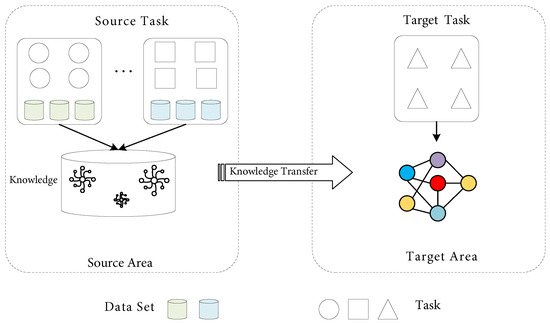 Relevant knowledge learned in previous tasks can be applied to other tasks that are not exactly the same, but related, by transfer learning, so as to complete related tasks more efficiently. In transfer learning, the learning goal is generally called a task, and the task mainly includes a label and a prediction function corresponding to the label. Generally, one or more subjects for learning are defined as domains, and each domain has its own feature attribute space and marginal probability distribution. In addition, the object that needs to be migrated is usually called the source domain, which itself has a lot of valuable knowledge, including a large amount of data and detailed annotations. The object that needs to be endowed with knowledge and annotation is termed the target domain. As shown in Figure 1, the process of the transfer will be completed when knowledge is transferred from the source to the target domain. The essence of transfer learning is to optimize the performance of the target domain’s prediction function through the knowledge in the source and target domains.