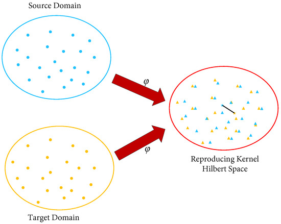 In the fault diagnosis process, directly transferring between two domains with unknown similarities or distribution differences will most likely lead to negative transfer of the fault diagnosis model. For this reason, many methods have been used to measure or estimate the distribution differences between different fields. Common measurement methods include Bregman divergence [28], Kullback–Leibler (KL) divergence [29], Jensen–Shannon (JS) divergence [30], and maximum mean discrepancy (MMD) [31]. Among them, Bregman divergence is a sample measure similar to distance estimation. Since it is generally used for solving the function of an objective for methods related to gradient descent, the Bregman divergence will generate a large time cost in the calculation of metrics [32]. KL divergence, also known as KL distance, is a classic sample similarity estimation method. However, this method belongs to the parametric measurement methods, and needs to update the prior probability density continuously during the measurement process. To a certain extent, it increases the amount of calculation and time complexity in the measurement process, which brings great inconvenience to the similarity judgment of the actual engineering dataset. The MMD algorithm is a parameterless distance measurement method, which does not need to pre-estimate the data distribution of the sample before performing the measurement. The method can be viewed as a measure of the distance of the two distributions in a regenerated Hilbert space. That is, the samples are mapped to the reproduced Hilbert space through a special mapping function , and then the mean difference of the source and target domains’ data samples on this space is calculated to reflect the difference of the distribution for the two domains, as shown in Figure 2. Compared with Bregman divergence, KL divergence, JS divergence, and other methods, the MMD has the advantages of non-parameterization, a simple and effective calculation, low time complexity, and intuitive judgment, and has become the most widely used metric method in transfer learning. In summary, this paper chooses the MMD algorithm as the measurement method for the similarity migration of shallow features of industrial motor bearings.