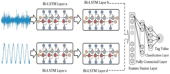 - Feature adaptive extraction and fusion. Two Bi-LSTM deep learning sub-networks adaptively extract features from the original vibration and current signal sources to deeply mine the deep-level mapping relationship and feature information of the industrial motor bearing vibration sensor signals and current sensor signals in various fault states. After that, the feature fusion layer fuses the vibration signal’s feature information and current signal’s feature information extracted by the Bi-LSTM sub-network. Moreover, in order to prevent overfitting, a dropout operation is added between the feature fusion and fully connected layers. The feature fusion part of the fault diagnosis model considered here does not use more complex feature fusion technology, but chooses direct serial fusion. This is because direct serial fusion has stronger versatility. In addition, no matter whether the feature average summation method or the feature screening fusion method are chosen, it will cause a certain amount of information loss. Direct serial fusion has a lower information loss rate and contains more comprehensive bearing status information. It is obvious to say that fault diagnosis is more suitable under small sample conditions.