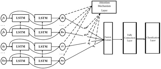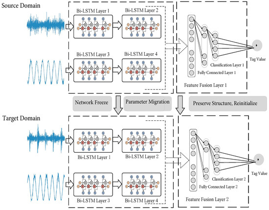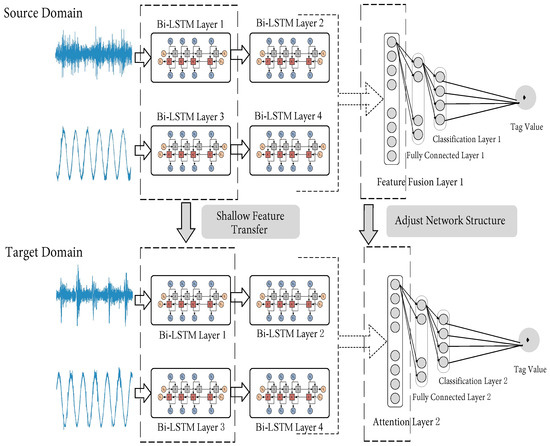 When the average value between the data of the bearing to be diagnosed (target domain dataset) and the similar data of the bearing (source domain dataset) is higher than the set threshold and lower than the set threshold (), it indicates that there is a certain difference of distribution for the selected datasets in the source and target domains. Moreover, properly adjusting the network structure and network depth of the fault diagnosis model in the source domain is necessary to generate a fault diagnosis model in the target domain. At this time, the network structure and network parameters of the shallow feature extraction part, i.e., Bi-LSTM layers 1 and 3 in the source domain, are frozen. In addition, they are directly migrated to the bearing fault diagnosis model of the target domain. At the same time, the fully connected and classification layers in the source domain of the bearing fault diagnosis model are retained, and their network parameters are reinitialized. In addition, as shown in Figure 5, a new attention mechanism layer is added in front of the fusion feature layer.