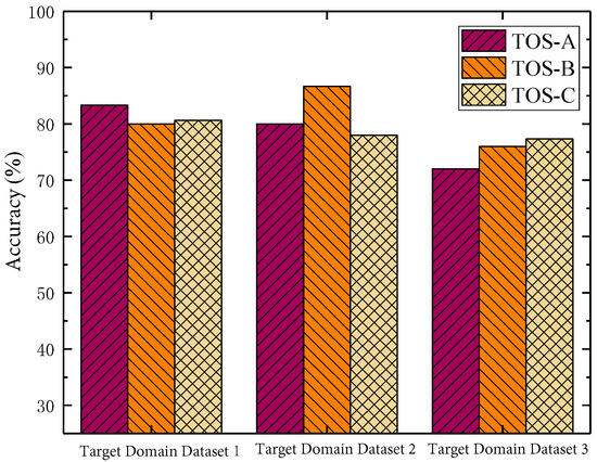 Figure 8 shows the accuracy of the optimization algorithms in fault diagnosis. The TOA-A algorithm, the TOA-B algorithm, and the TOA-C algorithm have achieved the best results in their respective advantageous processing ranges. Among them, the accuracy rate of the TOA-A algorithm is as high as 83.33% when using dataset 1 in the target domain for experiments. The accuracy rate of the TOA-B algorithm is as high as 86.67% when using dataset 2 in the target domain for experiments, The accuracy of the TOA-C algorithm is as high as 77.34% when using dataset 3 in the target domain for experiments. This shows that the MLMF-SS algorithm proposed in this section is reasonable. At the same time, it also proves that there is a certain correlation between the accuracy that can be achieved by the fault diagnosis algorithm and the maximum mean difference between fields.