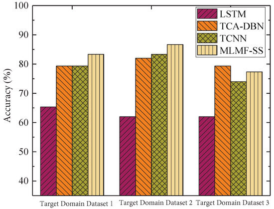 To evaluate the MLMF-SS algorithm, the long short-term memory neural network (LSTM)-based bearing fault diagnosis method, the fault diagnosis algorithm for bearing using transfer component analysis deep belief network (TCA-DBN), and the deep transfer convolutional neural network (TCNN)-based algorithm are selected as the comparison algorithms. To confirm the stability and reliability in terms of the results obtained from the experiments, several repeated experiments are carried out independently for each algorithm, and the performance of the algorithm is judged according to the average result of the experiment.
