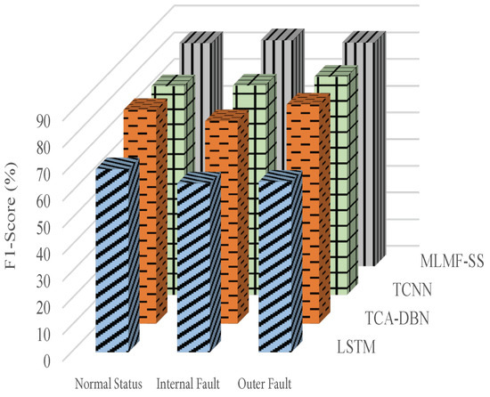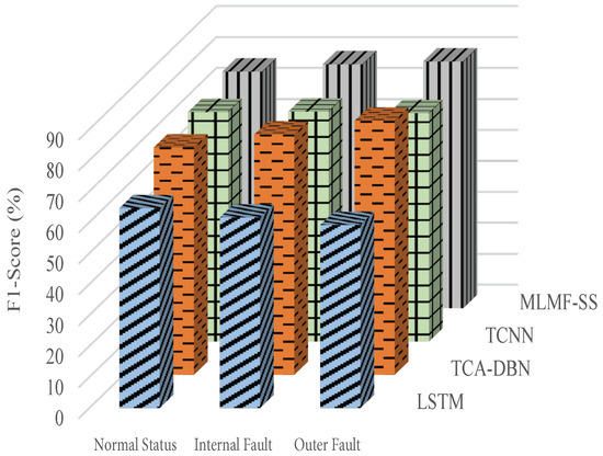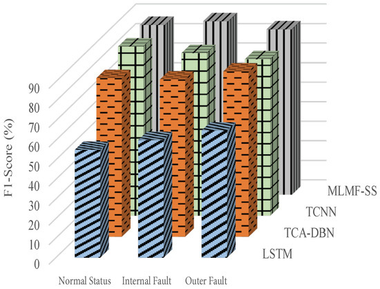 Figure 11, Figure 12 and Figure 13 show the algorithms’ F1 score indicators when using the datasets 1, 2, and 3, respectively, of the target domain for experiments. In terms of F1 score index, the proposed MLMF-SS algorithm performs well, and the fluctuation range is relatively small under different bearing operating conditions. This shows that the comprehensive performance of the MLMF-SS algorithm is excellent. In addition, although the MLMF-SS algorithm has a slightly lower diagnostic accuracy than the TCA-DBN algorithm when experimenting with dataset 3 in the target domain, in terms of the F1 score under different operating states, the MLMF-SS algorithm is basically better than the TCA-DBN algorithm. Combining the F1 score index and the accuracy of the fault for each algorithm, a better performance is achieved for the MLMF-SS algorithm compared to other comparative algorithms.