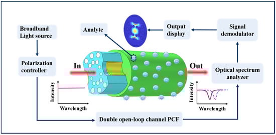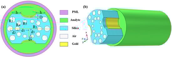 As far as light sensors such as optical fiber sensors (OFS) are concerned, they have more outstanding benefits than the electrical sensors noted in the preceding paragraph. In particular, they have the characteristics of a small size and strong anti-interference, far flung sensing can be realized, and there is the possibility for prepared integration and reuse []. Its outstanding sensing characteristics allow it to be used in more sophisticated and hostile environments, for example, underwater and in environments sensitive to electric induction. With the development of photonic fiber technology [,], it has been found that combining photonic crystal fiber (PCF) with plasmon resonance (SPR) technology can overcome the shortcomings of traditional optical sensors, such as not being able to bend at large angles and at a short transmission distance. These excellent characteristics of SPR-PCF sensors can effectively improve sensing sensitivity and show high efficacy in many fields.