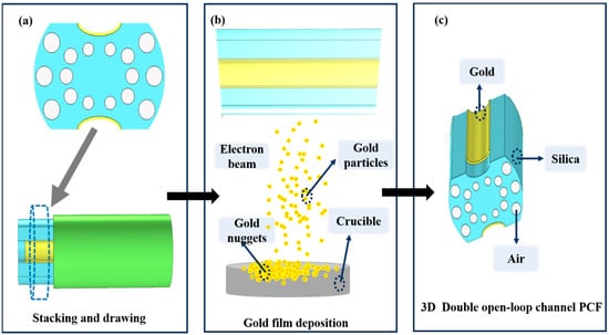 Figure 1 indicates a cross-section of the D-type dual-open-loop channel SPR-PCF designed in this paper. The PCF has a radius of 12 μm and can be processed with the aid of lofting and drawing. The grinding wheel polishing approach is used to graph grooves in the airplane of the top and bottom of the PCF (the aircraft is 8 μm from the middle of symmetry above and below) [,]. The Au film was coated on two open-loop channels by way of chemical vapor deposition or magnetron sputtering, and the magnetron sputtering technique used to be generally selected in the experiment [,,]. In Figure 1, h represents the width of the surface of the non-grooved part after polishing (one side), and D represents the thickness of the Au film. The specific parameter settings are shown in Table 1. R3, R4, and R5 point out the radii of holes 1, 2, and 3, respectively, d1 varies from the hub of the fiber core for the No. 1 hole, d2 is the range from the hub of air holes 1 and 2, d3 is positioned faraway vertically towards the cable’s hub for the No. 3 hole, and d4 is the horizontal distance. The radii of the R3 pore (No. 1 hole) and R4 pore (No. 2 hole) are rotationally symmetrical distributions around the core; the center of rotation is the center of the core, and the rotation angle is 30°. Among them, the No. 3 hole is the most special hole, and its distribution as well as size, etc., have the most influence on the SPR pattern compared to other air holes. The ideal preparation process of the dual open-loop channel PCF proposed in this paper is shown in Figure 2.