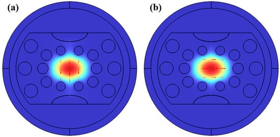 In this paper, numerical simulations of the D-type double open-loop channel PCF sensor nanostructure are performed using the control variables method with COMSOL 6.0 software based on finite element analysis [,]. Figure 4a,b exhibit the electric powered subject distribution of the Y-POL and X-POL imperative modes.
