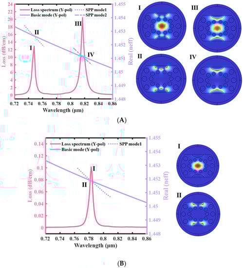 This paper’s SPR-PCF sensor nanostructure is not highly symmetrical in terms of rotation, so the X-POL and Y-POL mode have one-of-a-kind positive refractive indices. The SPR top loss excited by using the two core modes is unique []. The Y-POL core mode in the PCF sensor nanostructure described in this study exhibits more distinct SPR issues and better sensing capabilities than the X-POL core mode (the metallic movie layer is in the Y direction, so the excited SPR height mode is extra obvious in the Y direction, as shown in Figure 5A,B). In addition, by solving Maxwell’s equations for steel dielectric surfaces, we observe that the SPP mode is a mode that is generally excited with the aid of the electric field, which is orthogonal to the metal layer’s outside [,,]. The ERI of the Y-POL high-order SPP mode and low-order SPP mode (this paper normally studies Y-POL) at one-of-a-kind wavelengths, that is, the optical index’s real phase, which has an impact on the suggested sensor’s responsiveness and loss spectrum, is shown in Figure 4. The loss spectrum of the proposed sensor is shown in Figure 5, together with the real section of the ERI of the high-order SPP mode and low-order SPP mode of the X-POL at unusual frequencies. Comparing the two units of plots, we can observe that the loss top in X-POL is significantly less than the loss height in Y-POL by two orders of thousands. Moreover, in Figure 5, we can see that the lower-order SPR effect is more obvious than the higher-order one. After the above comparison, the main object of this paper is the low-order loss peak under Y-POL.