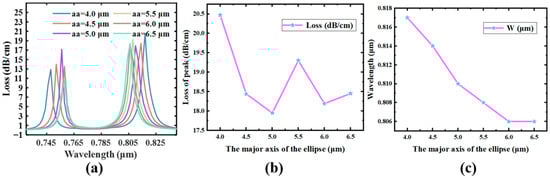 n = 1.40775, aa = 4 μm, R5 = 1 μm. (a) The effect of the change in elliptic semi-long axis aa on the loss peak. (b) The modification of the low-order mode’s highest point. (c) The change in wavelength where the maximum value of the loss peak of the low-order mode is located.