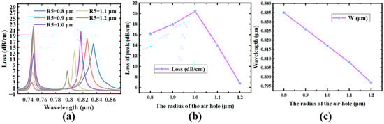 Last but not least, we also analyzed the radius of the No. 3 gap in the range from 0.725 μm to 0.875 μm, and Figure 8 shows that its loss spectrum increases with the radius of the bound hole in the PCF, one main to a make bigger and then a minimize in its ERI. The blue shift of the low-order SPR top is additionally derived from the phase-matching condition. The wastage increases from 16.19 dB/cm to 20.47 dB/cm when the binding hole radius increases from 0.8 μm to 1.0 μm. This is because as the binding hole radius increases, it makes the core energy concentrate in the middle of the two holes and coupled with the Au film, reduces the energy dissipation. However, when the radius of the holes increases from 1.0 μm to 1.2 μm, the loss decreases from 20.47 dB/cm to 13.98 dB/cm. This is because the leakage window between the two binding holes is too small as the radius of the binding hole increases []. This leads to a reduction in the ERI of the Y-POL, and it is difficult to allow the core energy to come out of the window and couple with the Au film. Therefore, the low-order SPR loss peak-to-peak value increases and then decreases, as in Figure 8b. After the above analysis, we chose to set the bound hole radius at 1.0 μm.