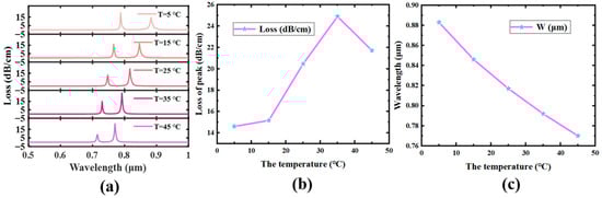 R5 = 1 μm, D = 30 nm, aa = 4 μm. (a) The effect of temperature change on the loss peak. (b) The change in the peak value of the low-order SPP mode. (c) The change in wavelength where the maximum fee of the loss top of the low-order SPP mode is placed.