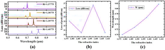 R5 = 1 μm, D = 30 nm, aa = 4 μm. (a) Effect of refractive index change on the loss peak. (b) The change in the peak value of the low-order SPP mode. (c) The change in wavelength where the maximum value of the low-order SPP mode is located.