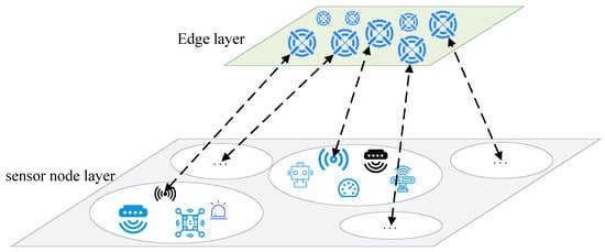 Generally, in a WSN, once the corresponding sensors are arranged, they will not move anymore. In set , all sensor nodes can communicate with each other and can communicate with edge nodes at the same time. Edge nodes can detect the remaining energy of different sensor nodes in the set. After the cluster head selection is completed, data transmission is mainly performed by the cluster head node and the edge node, as shown in Figure 1, which is the network structure diagram after the cluster head selection is completed. In the figure, all sensors at the sensor node layer may become cluster heads. The sensor node layer can represent a cluster formed in different areas, and the node pointed at by the arrow is defined as the cluster head. When cluster heads are re-selected, their regions may change. In the edge layer, some servers may be far apart geographically.