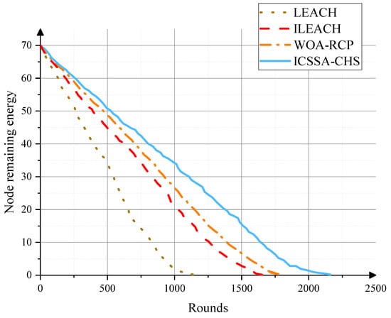 In addition, we analyze the relationship between the number of running rounds and the remaining energy of network nodes. Usually, the more energy left in each round, the lower the energy consumption of the node during the transmission process, which shows that our method can effectively improve the life of the network. As shown in Figure 6, it can be observed that as the number of rounds increases, the energy of network nodes decreases. This is because of the energy consumption caused by node operation. However, compared with other protocols, the ICSSA-CHS protocol performs well in reducing the remaining total energy of nodes, and the energy consumption of each round of the network is also less, making the node run up to 2206 rounds, which is higher than the other three methods and the limited extension of the network life cycle.