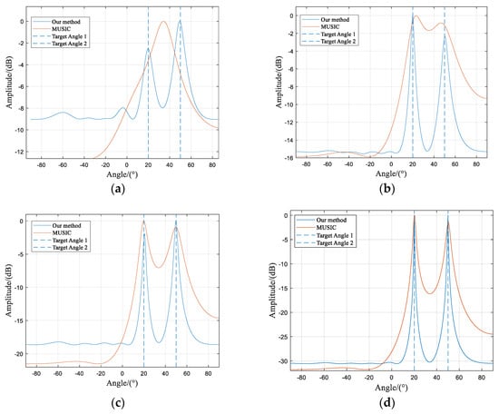 From Figure 3a, it can be observed that at an SNR of −15 dB, the traditional MUSIC algorithm fails to resolve the two incident signals correctly, and the DOA estimation results are erroneous. However, the algorithm proposed in this paper can clearly distinguish between the two incident signals. Both algorithms presented in Figure 3b–d successfully resolve the two signals. However, the traditional MUSIC algorithm exhibits wider spatial spectrum peaks, which indicates lower signal resolution compared to the method proposed in this paper.