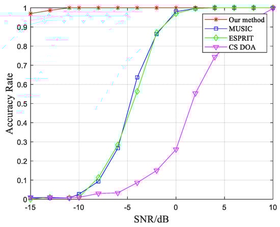 To validate the success probability of the algorithm for DOA estimation under various SNR conditions, a series of Monte Carlo experiments are conducted. The SNR is increased gradually from −15 dB to 10 dB with an interval of 2 dB, and each experiment is repeated 300 times. For reference, the success probability of three other methods, namely the conventional MUSIC, ESPRIT, and compressed sensing-based orthogonal matching pursuit algorithm [39], are also calculated under different SNR conditions. The experimental results are shown in Figure 4.
