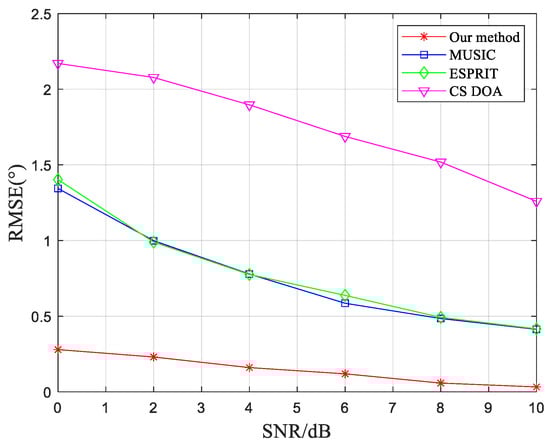 In addition to the success rate of DOA estimation, the accuracy of the algorithm’s DOA estimation is also a crucial factor. The RMSE mentioned in Equation (27) is used as the performance evaluation criterion for the algorithm. The experimental conditions are the same as those used to validate the success probability of DOA estimation in the previous analysis. Since the algorithms in the control group exhibit lower accuracy in DOA estimation under low SNR conditions, the RMSE is calculated for SNR values ranging from 0 dB to 10 dB. Experimental results are presented in Figure 5.