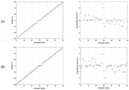 From Figure 7, it can be observed that the proposed algorithm exhibits strong robustness. Within the range of [−60°, 60°], even under low SNR conditions, the error remains within a range of ±2°, with a few points reaching ±3°. In this experiment, a relatively low SNR is set, which introduces significant noise. If the interference from noise is further reduced, the error in the experimental results may decrease even further.