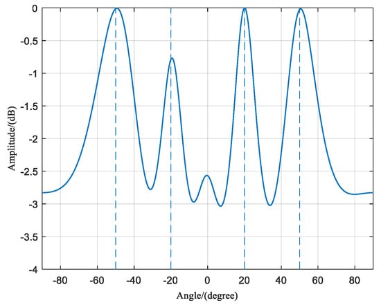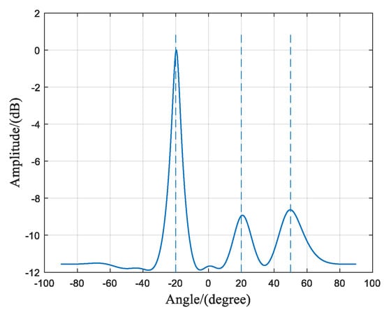 In the case where there are interference signals at two frequency points, with one frequency point containing two coherent signals, the frequency domain covariance matrix of the received signal is . Figure 12 shows two peaks, which further confirms that the eigenvalues of the frequency domain covariance matrix of the array-received signals are related to the number of target frequency points. Figure 13 represents the spatial spectrum of the DOA estimation using the proposed algorithm. Despite the interference signals at 20° and 50° being two coherent signals at the same frequency point, their amplitudes in the spatial spectrum are relatively smaller compared to the signals at the other frequency point. However, this does not affect the accuracy of the DOA estimation results.