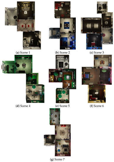 - Kolve, E.; Mottaghi, R.; Han, W.; VanderBilt, E.; Weihs, L.; Herrasti, A.; Gordon, D.; Zhu, Y.; Gupta, A.; Farhadi, A. AI2-THOR: An Interactive 3D Environment for Visual AI. arXiv 2019, arXiv:1712.05474. [Google Scholar]