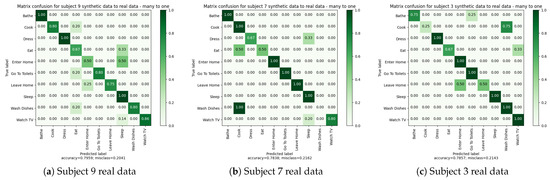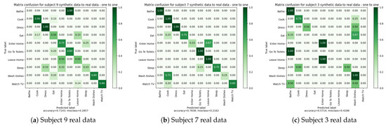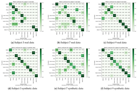 Additionally, we observed that the activity “Bathe” was not recognized for subject “9”, whereas it was recognized with 100% accuracy for subject “7”. Subject “3” had four activity classes out of ten that were not recognized. These results indicate that synthetic data can be used to train an algorithm and recognize activities in real data. However, relying solely on activity data from a single subject may not always be sufficient. Furthermore, the performance can be degraded by sensor malfunctions in real conditions, which can disrupt the activity recognition algorithm. Therefore, incorporating more data and variability into the training dataset is necessary to address these challenges.