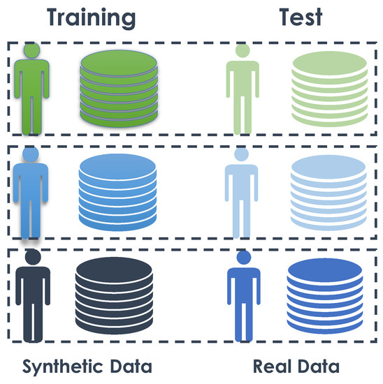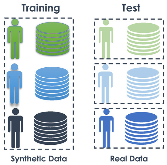 The objective of this experiment was to train one model using all synthetic data and then test it on the real data of each subject independently (see Figure 10). The purpose was to evaluate whether increasing the amount of data provided by the synthetic data from different subjects would improve the algorithm’s capabilities in recognizing daily activities. In the previous section, we observed that training an algorithm on synthetic data and testing it in real conditions can be successful. However, the quantity of training data was not very representative and still relatively close to the real data. The performance could be enhanced by presenting the algorithm with examples of different lifestyles within the same living environment, allowing for better generalization.
