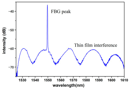 The reflective spectrum of the fabricated temperature and humidity sensor is shown in Figure 4. The wavelength of the infrared light source ranged from 1520 nm to 1620 nm. In Figure 4, it can be clearly noticed that there was a reflection peak of FBG at 1550 nm and an interference spectrum of the porous anodic alumina film.
