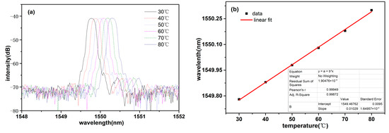 At first, when the humidity was maintained at an 84% RH, the temperature-sensing performance of the sensor was investigated. During the temperature experiment, in order to stabilize the interference spectrum of the sensor, the sensor was put into a stable humidity environment which was created with a saturated potassium chloride solution. Subsequently, an airtight bottle (the sensor probe and the saturated salt solution were within it) was put into a blast drying oven (9055A; Shanzhi Instrument Equipment Co., Ltd., Shanghai, China) to conduct the temperature test. When the temperature value set was reached, the environment temperature was maintained for 10 min. The reflective spectra of the FBG at different temperatures are shown in Figure 5a. As shown in Figure 5a, the Bragg wavelength of the temperature and humidity sensor showed a red-shift with the rise of temperature. For the temperatures of 30 °C, 40 °C, 50 °C, 60 °C, 70 °C, and 80 °C, the peak wavelengths of the FBG were 1549.78 nm, 1549.88 nm, 1549.98 nm, 1550.08 nm, 1550.18 nm, and 1550.3 nm, respectively. The relationship of the peak wavelength and its corresponding temperature is plotted and fitted in Figure 5b. The fitted line shows the peak wavelength was linearly responsive to the temperature, and its linearity was 0.99949. The temperature detection experimental results reveal that the prepared optical temperature and humidity sensor had a temperature sensitivity of 10.4 pm/°C.