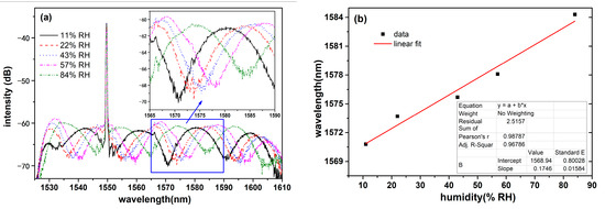 After the temperature experiment, the humidity-sensing performance of the sensor was investigated with the temperature maintained at 25 °C and the saturated salt solutions. Different humidity environments within the testing bottle were generated by the saturated salt solutions which were prepared with lithium chloride (11.3% RH, 25 °C), potassium acetate (22.51% RH, 25 °C), potassium carbonate (43.16% RH, 25 °C), sodium bromide (57.57% RH, 25 °C), and potassium chloride (84.34% RH, 25 °C) separately. The reflective spectra of the temperature and humidity sensor in different humidity environments are shown in Figure 6a. As shown in Figure 6a, the interference spectrum of the porous anodic alumina film showed a red-shift with the increase of humidity. In other words, the interference spectrum of the sensor moved to a longer wavelength, when the environment humidity was increased. The troughs of the interference spectrum was suitable for wavelength extraction. As shown in Figure 6a, the trough near 1550 nm was disturbed by the FBG peak, and the trough near 1590 nm drifted out of the detection area of the optical spectrometer if the relative humidity was high than an 80% RH; however, the trough near 1570 nm did not have the above interfering factors. In order to clearly show the wavelength shift, the spectra from 1565 nm to 1590 nm are magnified, which are put in Figure 6a. In the magnified spectra, it can be clearly observed that the wavelength shift of the characteristic valley was 13 nm with the humidity increase from 11% RH to 84% RH. When the environment humidity values were 11% RH, 22% RH, 43% RH, 57% RH, and 84% RH, the wavelengths of the characteristic valley were 1570.8 nm, 1573.7 nm, 1575.7 nm, 1578.1 nm, and 1584.3 nm, respectively. The relationship of the characteristic wavelength and its corresponding humidity is plotted and fitted in Figure 6b. The humidity detection experimental results reveal that the prepared optical temperature and humidity sensor had a humidity sensitivity of 185 pm/%RH, and it is linearly responsive to the humidity with a linearity of 0.98787.