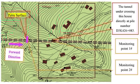The point #1 monitoring was arranged next to the target building. Another monitoring point (#2) was arranged above the palm surface, and it moved along in the direction of the tunneling. The position and arrangement of the monitoring points are shown in Figure 1.